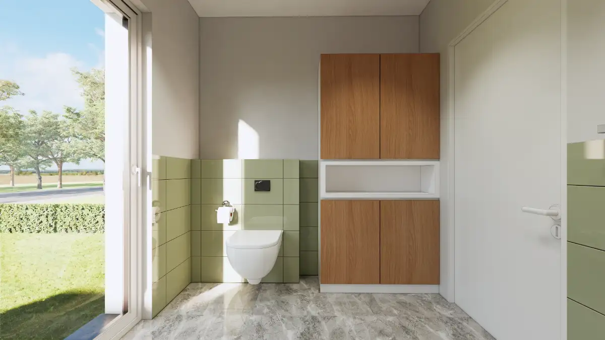 Das Gästezimmer bietet angenehme Übernachtungsmöglichkeiten, und ein separates Gäste-WC trägt zur praktischen Gestaltung bei. Der Technikraum wurde großzügig ausgelegt, um alle technischen Einrichtungen effizient zu organisieren und zusätzlichen Lagerplatz zu bieten.