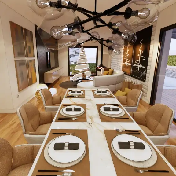 Das Gästezimmer bietet angenehme Übernachtungsmöglichkeiten, und ein separates Gäste-WC trägt zur praktischen Gestaltung bei. Der Technikraum wurde großzügig ausgelegt, um alle technischen Einrichtungen effizient zu organisieren und zusätzlichen Lagerplatz zu bieten.