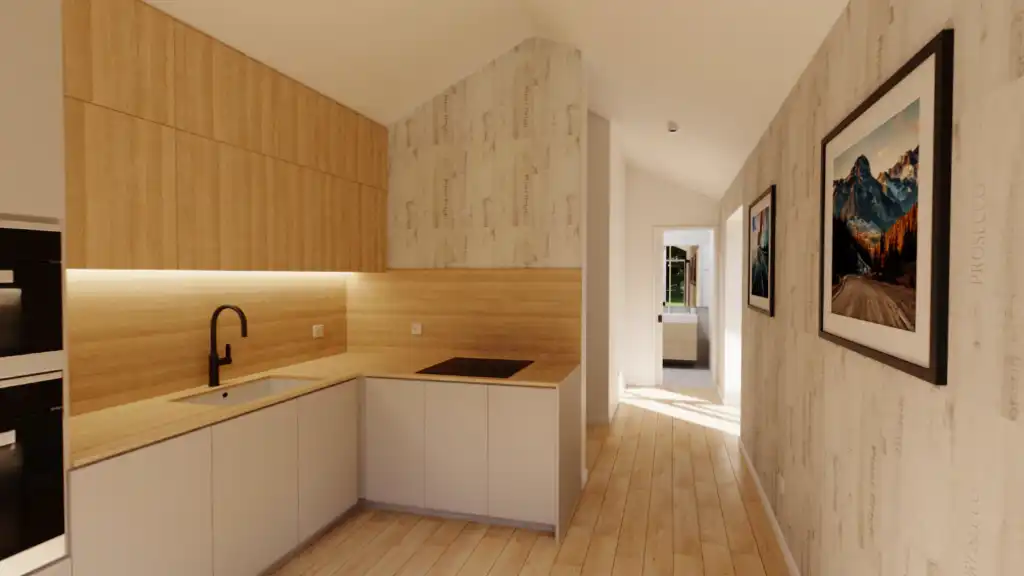 Weiterhin erwartet dich ein geräumiges Schlafzimmer mit 10 m², plus ein begehbarer Kleiderschrank von 3,8 m² – alles kompakt und effizient geplant. Die Wandstärke des Moduls beträgt 24 cm oder 26 cm in der KfW 40-Variante. Welche Variante am besten zu dir passt, erörtern wir gerne im Gespräch.